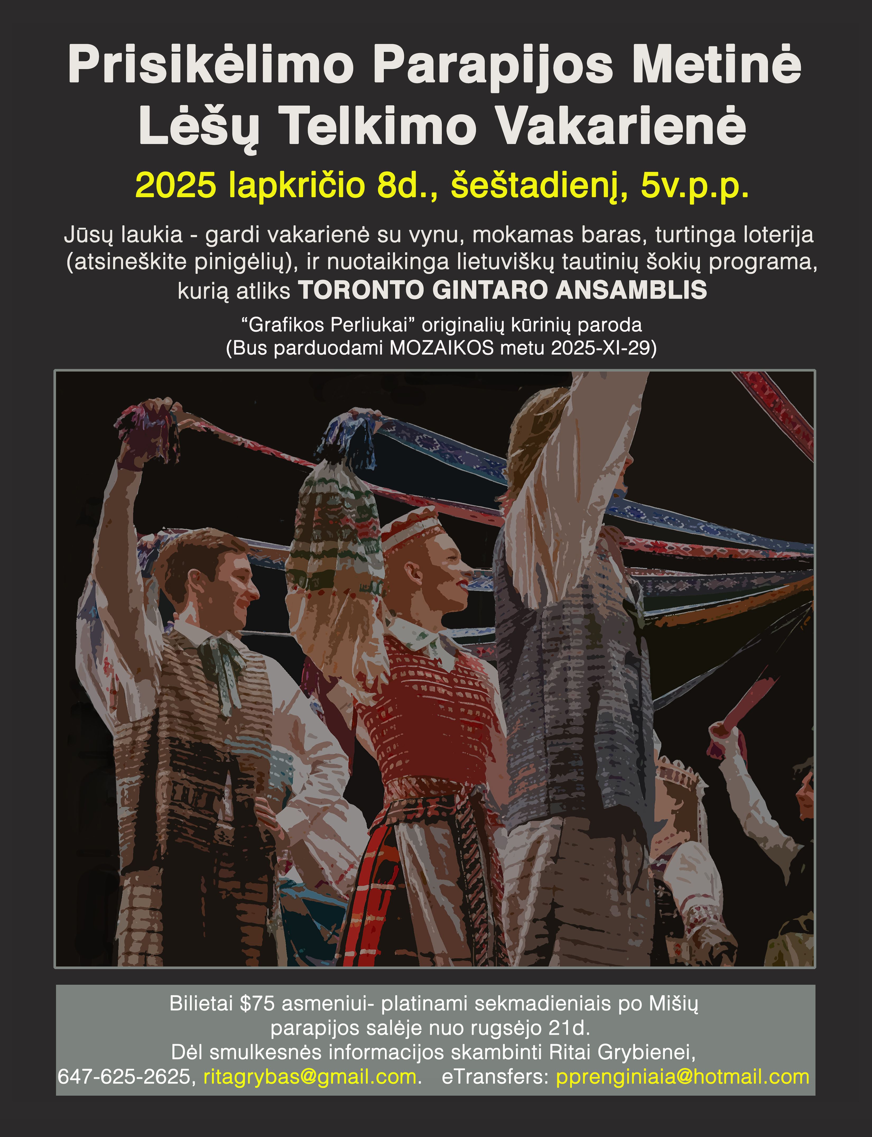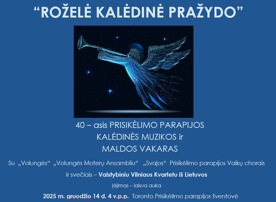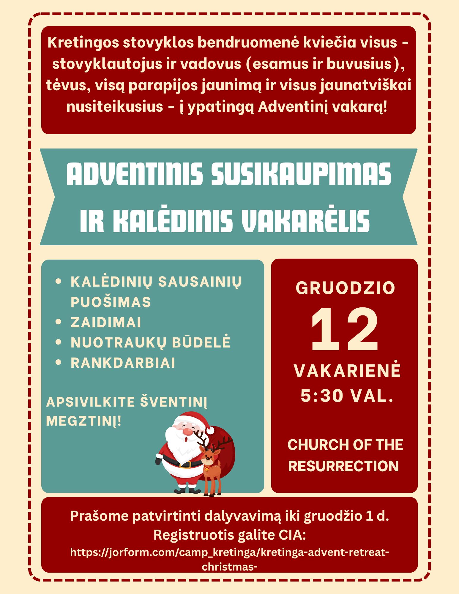 Artėjantys renginiaiMetinė Lėšų Telkimo Vakarienė Lapkričio 8 d.Tyliosios Meno Varžytinės MOZAIKA III Adventinių vainikų dirbtuvėlė Kretingos stovyklos bendruomenė kviečia į Adventinį susikaupimą Lietuviška virtuvė lapkričio 23 d. 40-asis kalėdinis koncertas ir maldos vakaras 2025 gruodžio 14 d.